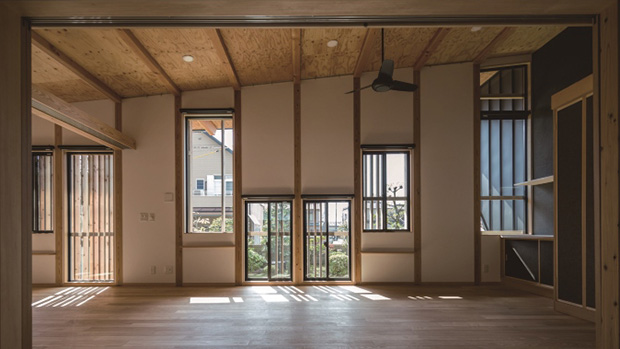 軒は西に行くにつれて高く・広くし、南面には高さの異なる開口を設け、個々に異なる間隔で木製の縦ルーバー(断面30×120mm)を並べて覆った。こうすることで、小型犬の庭への視線を確保するとともに、室内の南側半分を占める一つの大きなリビング空間に、光と風の入り方の変化をつける。また、床を高くしたことでうまれる、道を行き来する人と視線の交錯を和らげ、外部からの侵入を遮ったり、暴風時には窓を守るなどの役割も持つ。