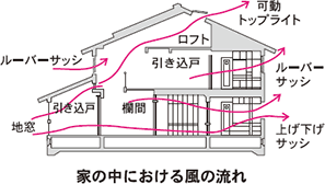 夏は風の流れができるように工夫しましょう。冬は、植栽などで北風をやわらげましょう。