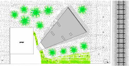 そこで設計者は、建物を45°回転させるとともに建物の形をひし形とし、さらに外壁を内側に湾曲させました。こうすることにより隣家との間に距離を保ち、庭に多くの緑を植え、プライバシーを確保しながら開放的な家を実現しました(図22左下参照)。