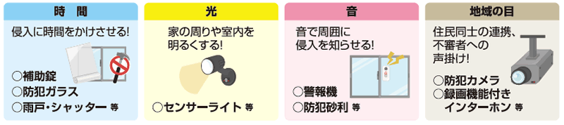 犯罪の4つの原則は「時間」「光」「音」「地域の目」です。この4原則に基づく対策を組み合わせることで、大きな防犯効果を得ることができます。