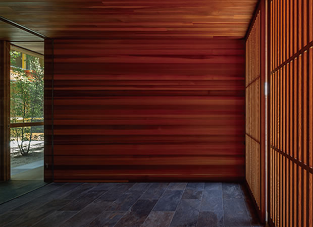 一階のエントランスや玄関は、中庭からの直接光や反射光をあまり期待できない。あえて、玄関壁床タイルを濃色として陰影を強くし、薄暗く木漏れ日の下にいるように表現した。反転して二階部分は大きな中庭の四方から光を感じさせる空間となっており、廊下 階段 LDKに面して回遊導線とし、中庭に開かれた明るい開かれた空間としている。
